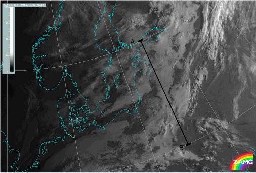 04 October 2005/06.00 UTC - Meteosat 8 HRV image; position of the Vertical Cross Section indicated.