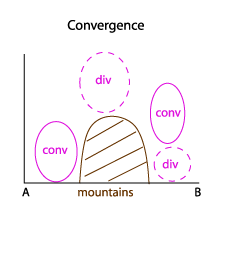 There is convergence on the windward side from the surface up to middle levels and convergence on the lee side from middle to high levels;