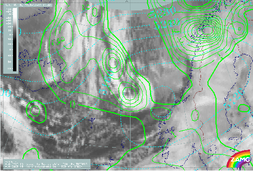 23 February 2001/05.54 UTC - NOAA CH4 image; magenta: surface isobars, blue: height contours 500 hPa