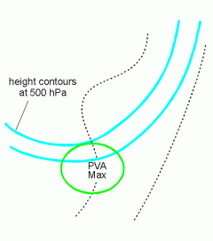A PVA maximum is superimposed upon the cloud bulge in the higher levels of the troposphere (500 and 300 hPa),