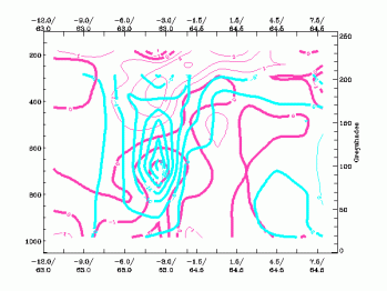 14 November 2004/00.00 UTC - Vertical cross section; magenta thin: divergence, magenta thick: convergence, cyan