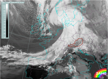 - high albedo values in the VIS image in the centre of the cloud shield and gradually decreasing values to the