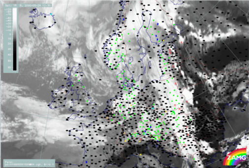 29 May 2000/06.00 UTC - Meteosat IR image; weather events (green: rain and showers, blue: drizzle, cyan: snow, red: thunderstorm with