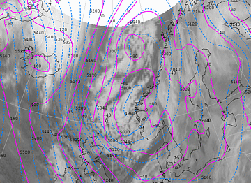 28 January 2004/12.00 UTC - Meteosat WV image; magenta: potential vorticity 303K
