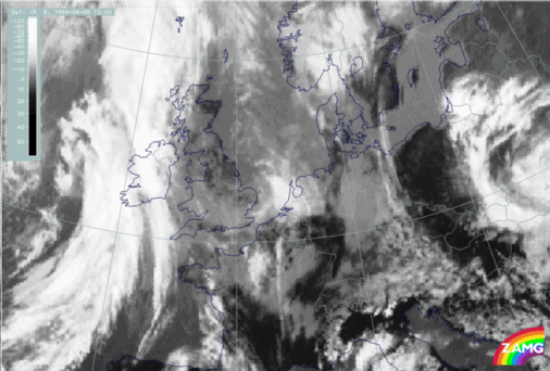As mentioned above, most of the pixel values within the cloud band are coloured/enhanced in yellow (low level cloudiness); only above the North Sea in front of and above the north-west coast of the Netherlands are they coloured/enhanced in white (multi-level cloudiness).
