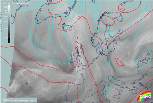 10 April 1996/00.00 UTC - Meteosat WV image; cyan: potential vorticity 310K, red: isobars