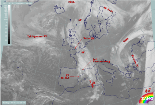 17 April 1996/06.00 UTC - Meteosat IR image; SatRep overlay: names of conceptual models