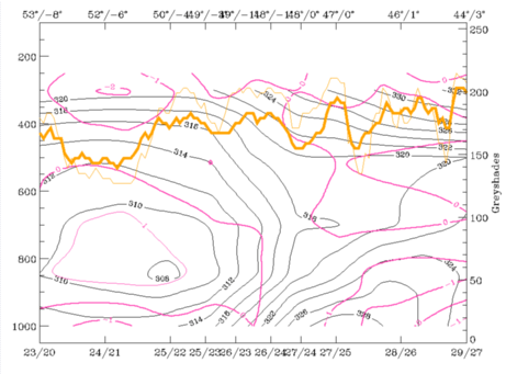 07 June 1997/06.00 UTC - Vertical cross section; black: isentropes (ThetaE), yellow: isotachs, orange thin: IR pixel values, orange thick: