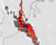07 June 1997/13.00 UTC - Radar image; red: precipitation rates