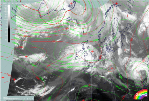 03 August 1997/00.00 UTC - Meteosat IR image; red: height contours 1000 hPa, green: height contours 500 hPa