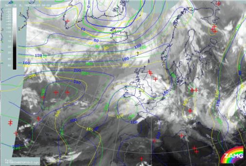 02 August 1997/06.00 UTC - Meteosat IR image; yellow: thermal front parameter (TFP) 500/850 hPa 06.00 UTC, green: thermal front