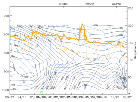 24 August 1997/18.00 UTC - Vertical cross section; black: isentropes (ThetaE), blue: relative humidity, orange thin: IR pixel