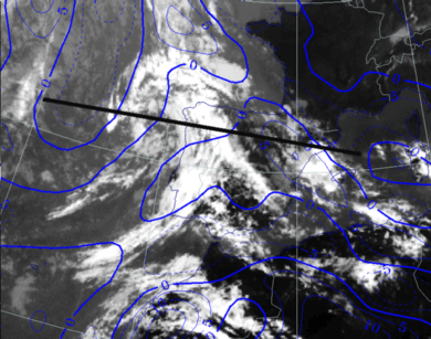 25 September 1997/12.00 UTC - Meteosat IR image; blue: thermal front parameter (TFP) 500/850 hPa; position of vertical cross section indicated