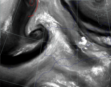 In the WV image the second front over the Iberian Peninsula is very distinct. But in the cross section no significant vertical velocity is evident while in the (old) front that is located more to the east, relatively strong vertical motion (omega) is visible. West of Portugal a WV dark stripe can be seen indicating dry sinking air. There is a minimum of the height of the tropopause more to the north in the Upper Level Trough but the values are not particularly low.
