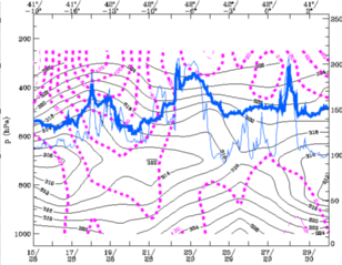 25 September 1997/12.00 UTC - Vertical cross section; black: isentropes (ThetaE), magenta: relative humidity, blue thin: IR pixel