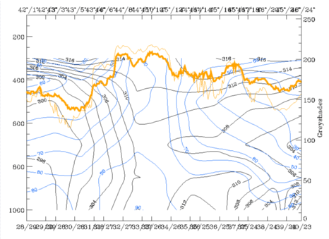 12 November 1997/06.00 UTC - Vertical cross section; black: isentropes (ThetaE), blue: relative humidity, orange thin: IR pixel values, orange thick: WV
