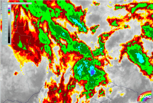 12 November 1997/18.30 UTC - Meteosat IR image; red: mean values of grey shades of cloud development and decay