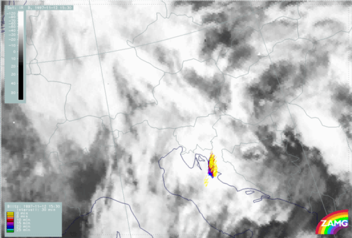 12 November 1997/15.30 UTC - Meteosat IR image; red: mean values of grey shades of cloud development and decay
