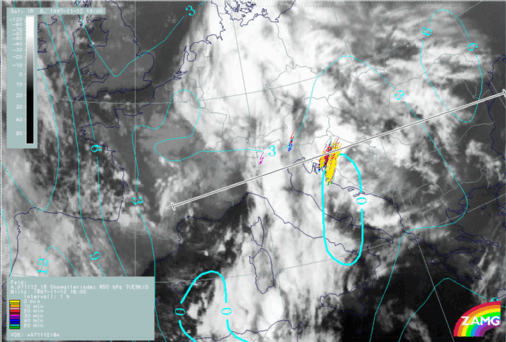 12 November 1997/18.00 UTC - Meteosat IR image; cyan: Showalter index 500/850 hPa, lightning reports; position of vertical cross section indicated
