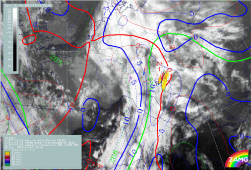 A second area of interest is the bluish elongated area from south Austria across Slovenia to some parts of Croatia. This is the system Th1 which has been detected in the period 06.00 - 12.00 UTC within the frontal cloud band over north Italy.