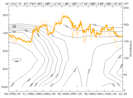 12 November 1997/18.00 UTC - Vertical cross section; black: isentropes (ThetaE), orange thin: IR pixel values, orange thick: WV pixel values