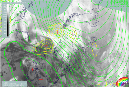 29 January 1998/12.00 UTC - Meteosat IR image; yellow: isotachs 300 hPa, red: positive vorticity advection (PVA) 300 hPa