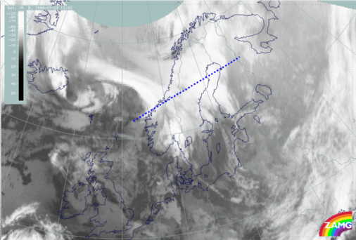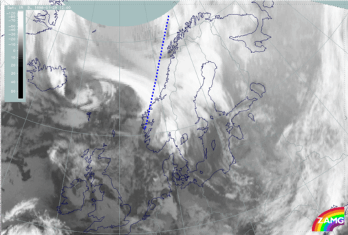 The cross section is across the wave cloud band (left image) within the warm advection area of the Wave. The isentropes show a distinct warm advection maximum in the Wave area (right image). Warm advection extends throughout the troposphere. Two Warm Front - like zones with surface fronts can be seen; these frontal zones merge in middle altitudes in the centre of the cross section. The cold advection on top of warm advection in the left part of the cross section is associated with the south-western cloud band, and shows the unstable developments taking place near the coast of Norway. This process is due to the approach of an upper level low from east of Iceland.