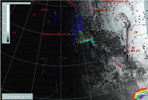 16 March 1998/03.00 UTC - Meteosat IR image; weather events (green: rain and showers, blue: drizzle, cyan: snow, red: thunderstorm with