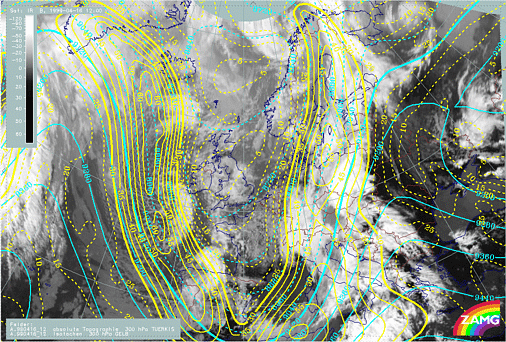16 April 1998/12.00 UTC - Meteosat IR image; cyan: height contours 300 hPa, yellow: isotachs