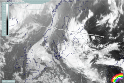 15 June 1998/00.00 UTC - Meteosat IR image; position of vertical cross section indicated