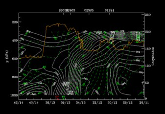 15 June 1998/00.00 UTC - Vertical cross section; white: isentropes (ThetaE), green thin: divergence, green thick: convergence, orange thin: IR pixel
