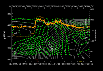 15 June 1998/06.00 UTC - Vertical cross section; white: isentropes (ThetaE), green: Q-Vector (normal component), orange thin: IR pixel values, orange thick: WV