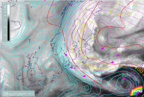 15 June 1998/06.00 UTC - Meteosat WV image; cyan: height of PV=2 units 324K, red: isobars 324K