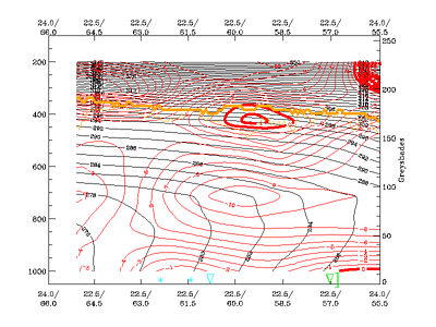 16 November 2001/06.00 UTC - Vertical cross section; black: isentropes (ThetaE), red: temperature advection, orange thin: IR pixel