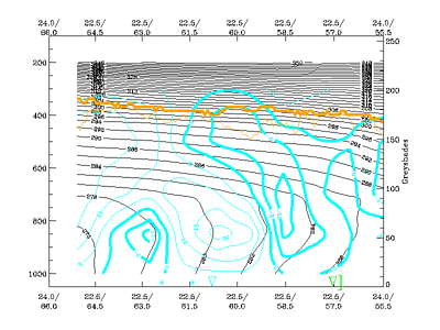 15 November 2001/06.00 UTC - Vertical cross section; black: isentropes (ThetaE), green: potential vorticity, orange thin: IR pixel