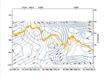 05 July 1997/12.00 UTC - Vertical cross section; black: isentropes (ThetaE), orange thin: IR pixel values, orange thick: WV pixel values