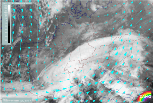 The typical example is from 09/12.00 UTC (where the frontal cloud band can be identified exactly over and north of the Alps) to 09/18.00 UTC (where the frontal cloud band is already south of the Alps extending from N. Italy to SE Austria). There are several typical cloud features that result from the propagation of a Cold Front band across the Alps from north to south: