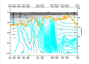 As already mentioned in the chapter of the Comma and Comma crossing there are some reservations when using vertical cross sections in the region of the Alps, because of a lack of orography in the numerical model data as well as in the vertical cross section algorithm. Even so, remarkable results can be achieved by using this material.