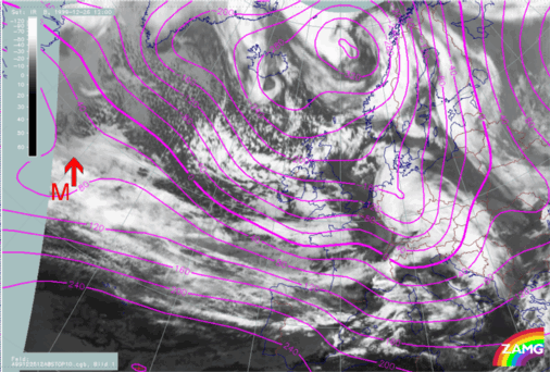 26 December 1999/12.00 UTC - Meteosat IR image; magenta: height contours 1000 hPa