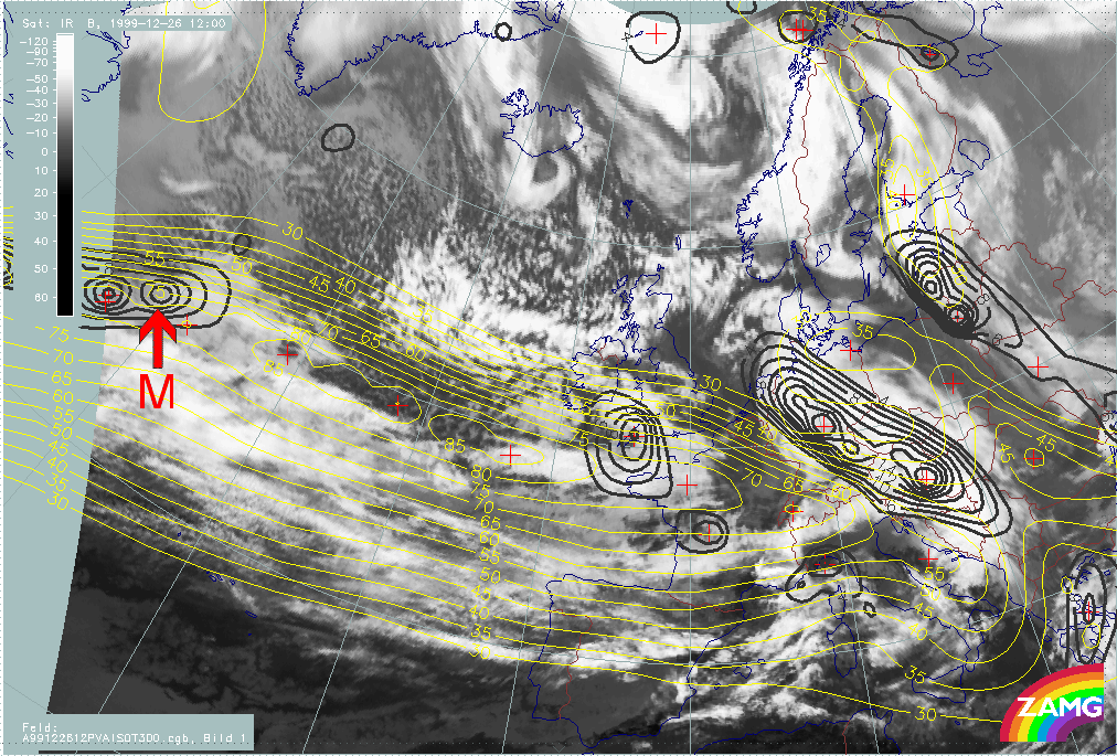 26 December 1999/12.00 UTC - Meteosat IR image; yellow: isotachs 300 hPa, black: positive vorticity advection (PVA) 300 hPa