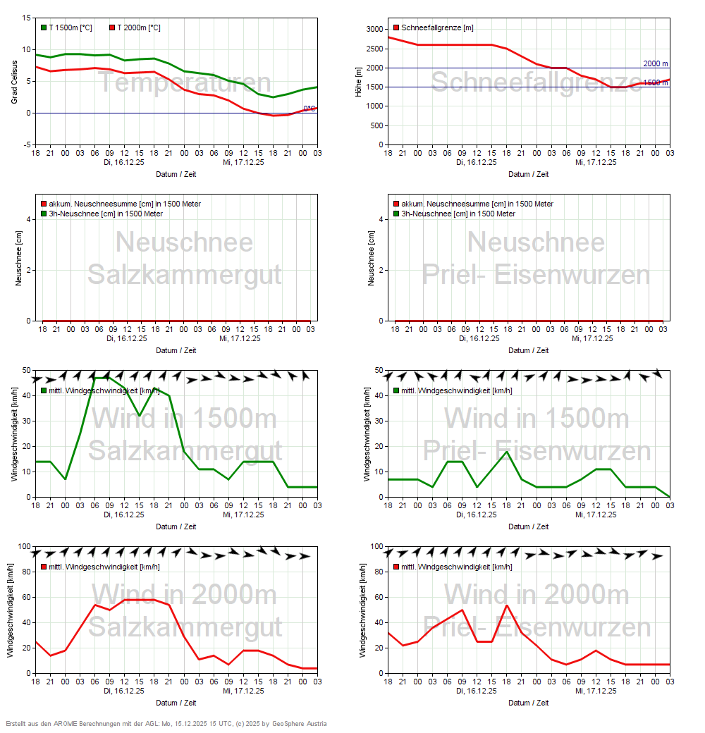 Am Dienstag schränken in Talnähe örtlich Nebelfelder die Sicht ein. Darüber ist es recht sonnig, wobei durchziehende hohe Wolkenfelder den Sonnenschein dämpfen. Es ist föhnig, der Wind weht in den Föhnschneisen der Kalkalpen mit Spitzen um 60 km/h. Temperaturen in 1500 m um 10 Grad, am Dachsteingipfel um -1 Grad.